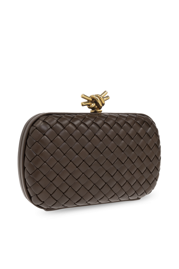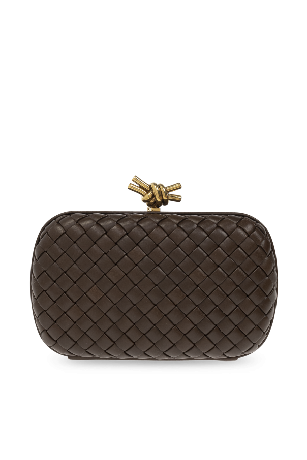 Brown ‘Knot Small’ clutch from Bottega Veneta. Crafted from calf leather with the iconic Intreccio weave, this design fastens with a decorative brass closure with a knot motif in antique gold-tone and has one internal compartment.