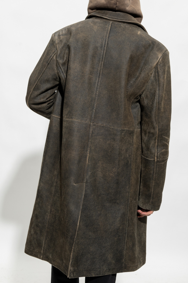 Brown ‘L-COAT-TREAT’ coat from Diesel. Crafted from lamb leather with a vintage effect, this style features notch lapels, button fastenings, three slip pockets and long sleeves.