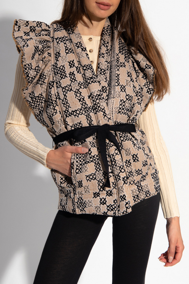 Beige and black vest from Forte Forte. Fastened with buttons, this garment is enriched by a pattern, lurex thread, waist belt and ruffled sleeves with raw cut edges.