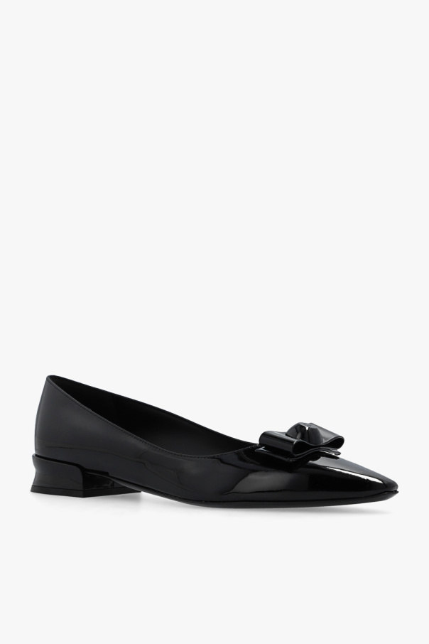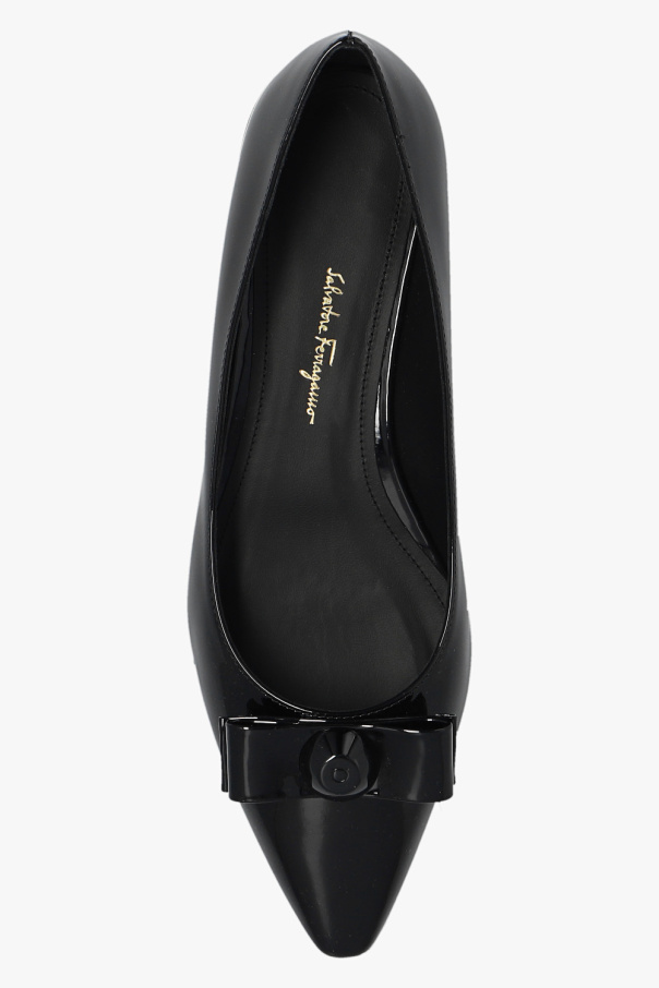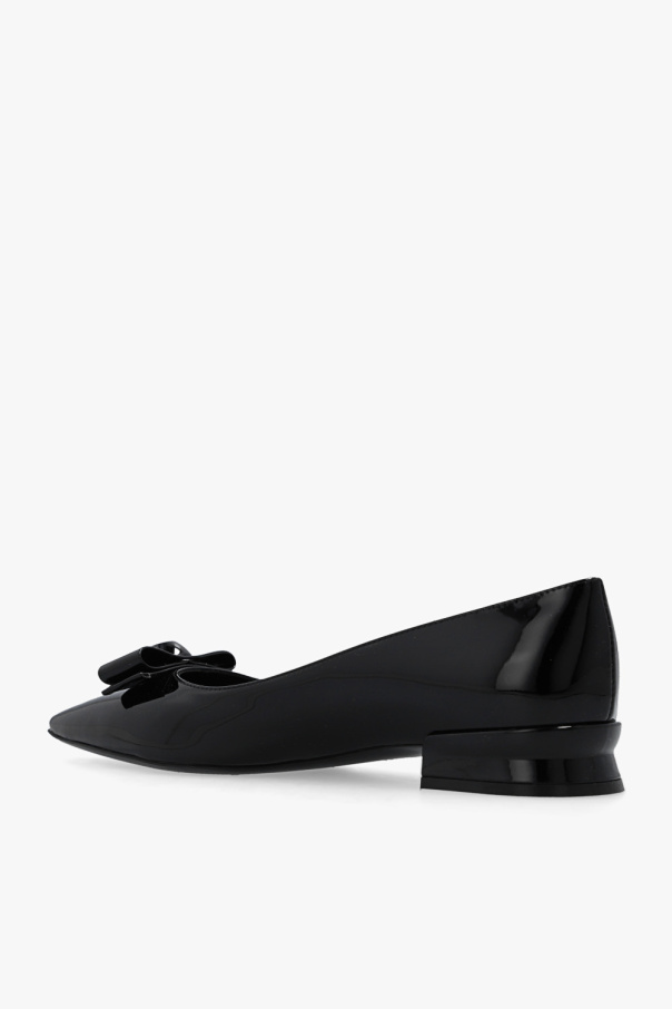 Black ‘Katrin’ ballet flats from FERRAGAMO. Made of patent calf leather, this model features a pointed toe, decorative bow and black leather sole.