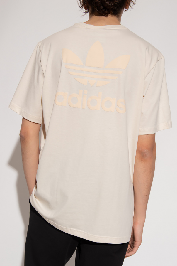 Cream crewneck T-shirt from ADIDAS Originals. Crafted from cotton, this style features short sleeves, an elasticated collar and a graphic print with the brand's logo.