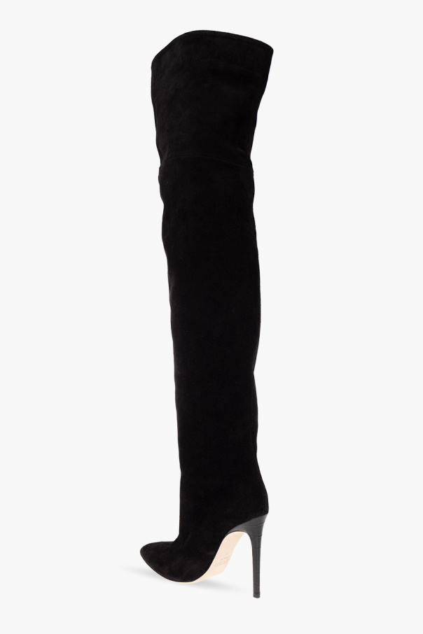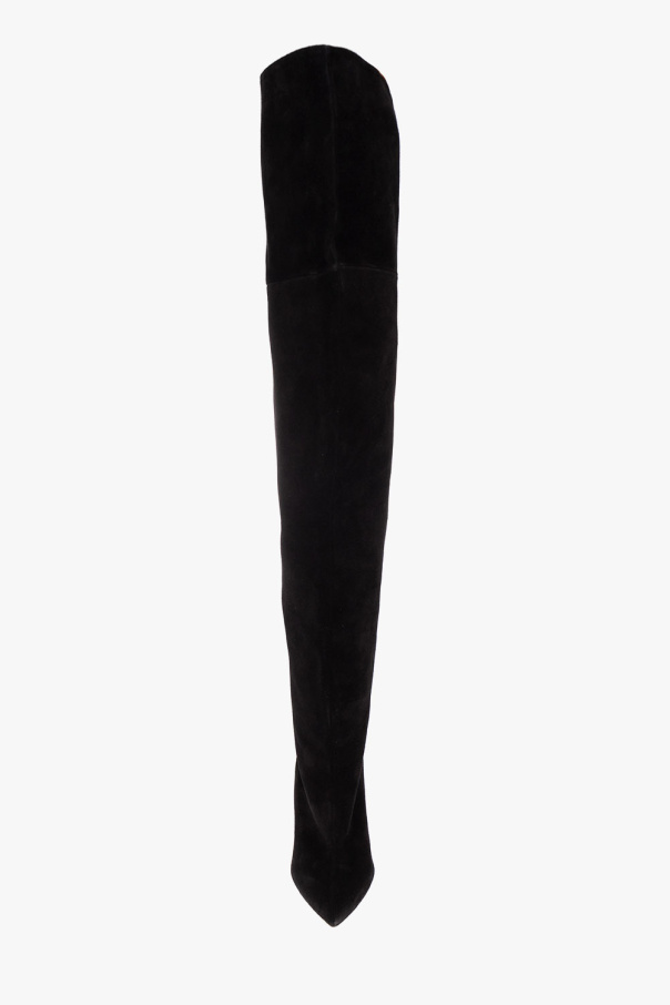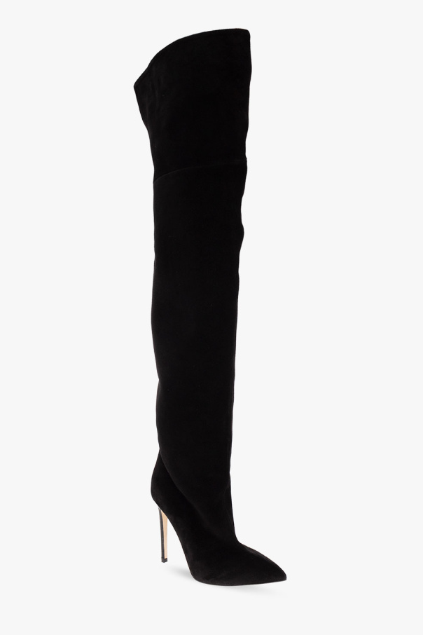 Black over-the-knee heeled boots from Paris Texas. Crafted from calf suede with a slip-on silhouette, this model sits on a light beige leather sole and features a high heel in croc-effect leather.