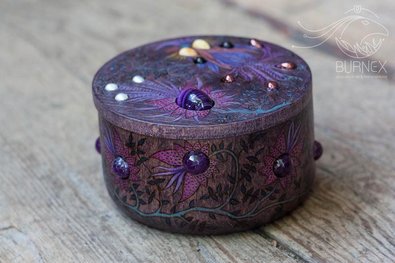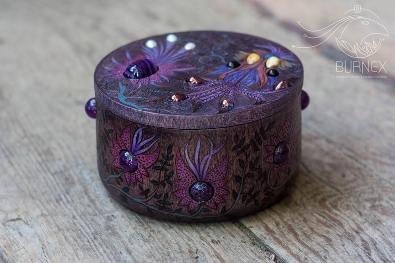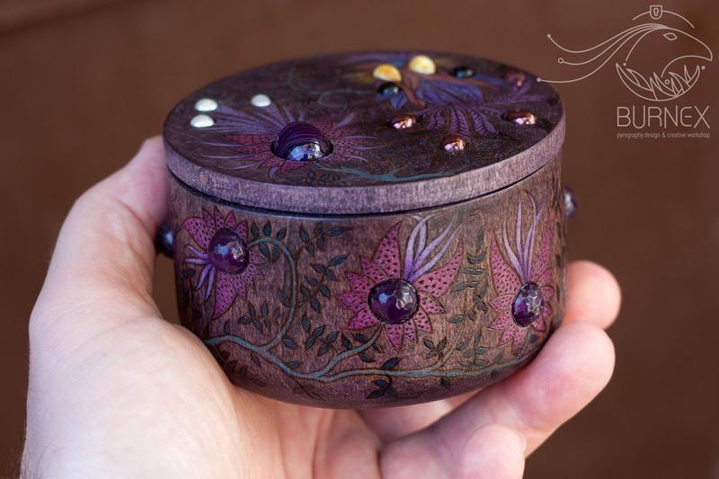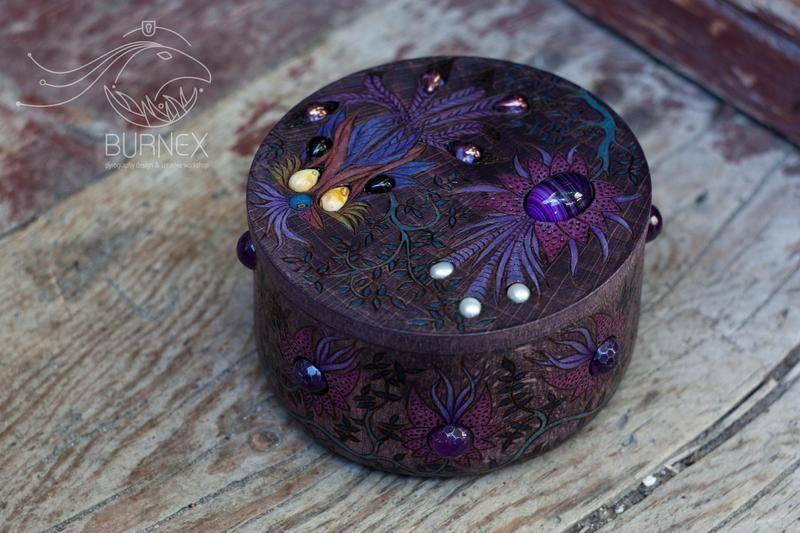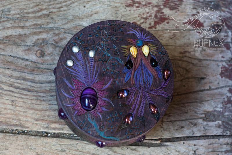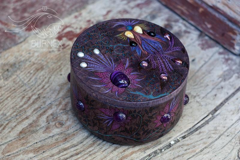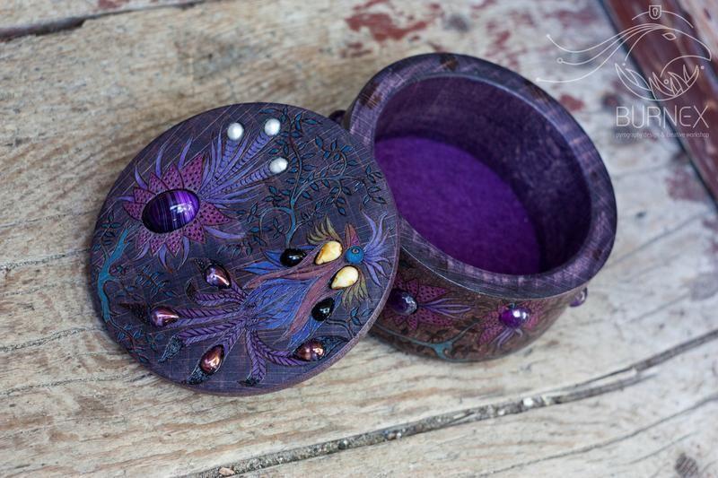 Дерево. Рисунок - пирография (выжигание). Инкрустировано разными бусинами. Полностью ручная работа. Внутри фетр. Внешний диаметр шкатулки примерно 9.5 см, внутренний - примерно 7.5 см. Внешняя высота примерно 6 см, внутрення - 3 см.Состояние: НовоеЦвет:- Разноцветный