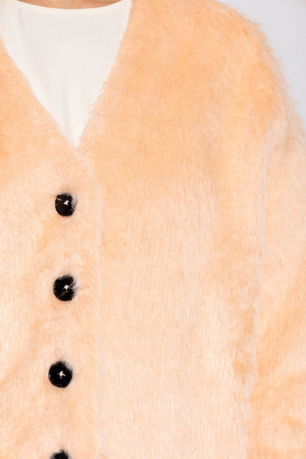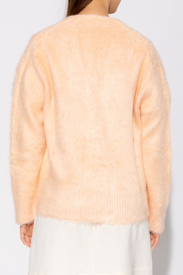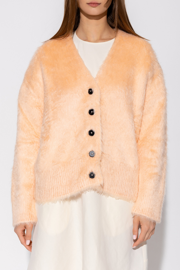 Light orange cardigan from Jil Sander. Made of silk, this V-neck design features black buttons and long sleeves.