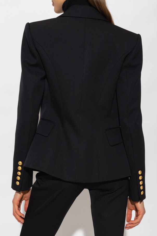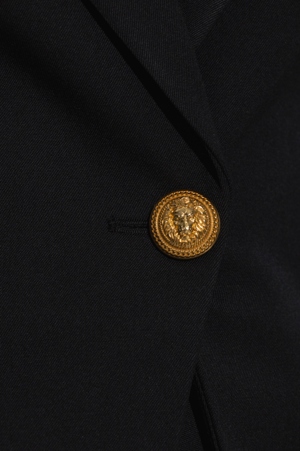 Black blazer from Balmain. Made of wool, this style fastens with a gold-tone button with an engraved logo and features one welt pocket, two flapped pockets, long sleeves and padded shoulders.