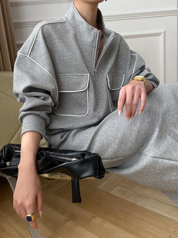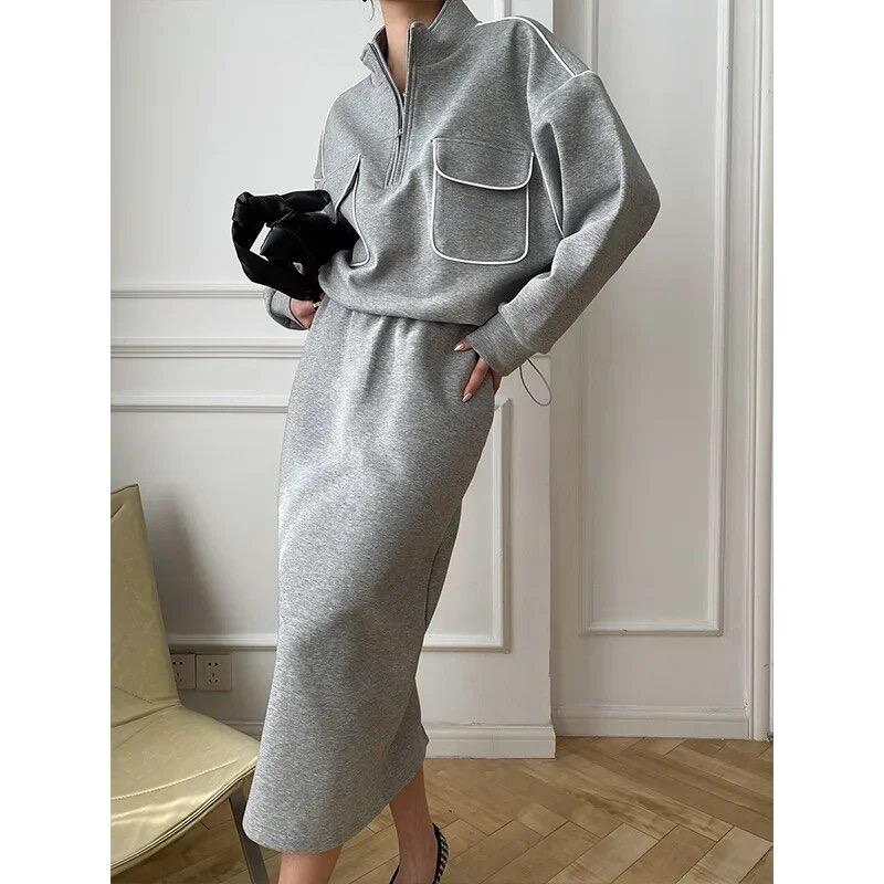 Спідниця міді + обʼємне худі, декороване кишенями, має воротнік-стійку із змійкою.