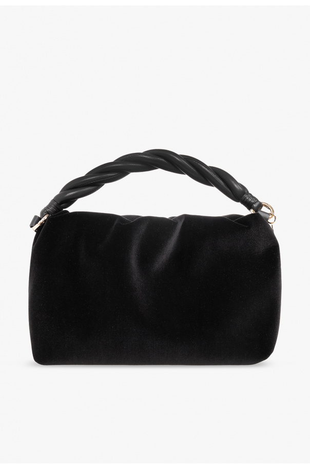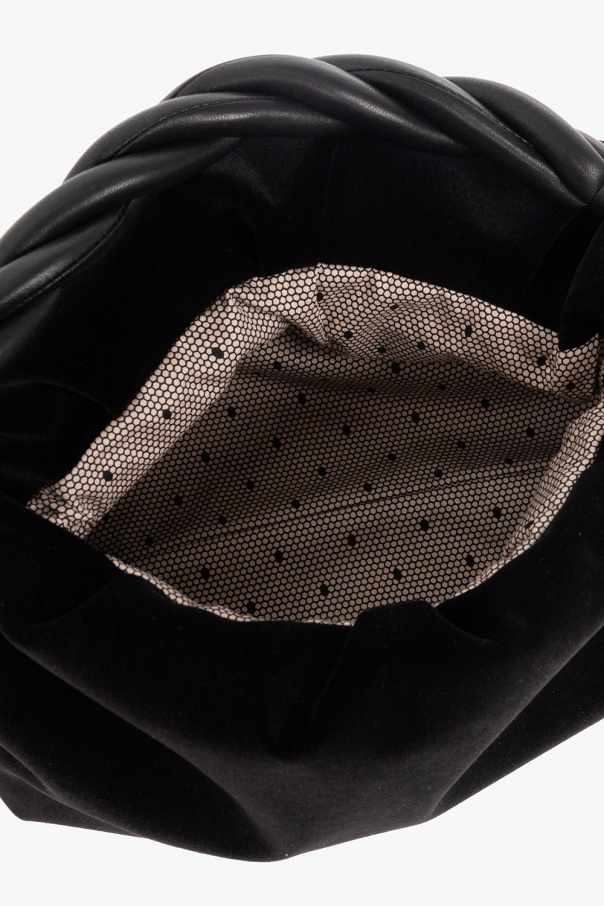 Black handbag from Red Valentino. Rendered in velvet, this design secures with a magnetic snap and features a distinctive half-round handle in braided lamb leather, a detachable shoulder strap, light gold-tone metal hardware and one internal compartment.