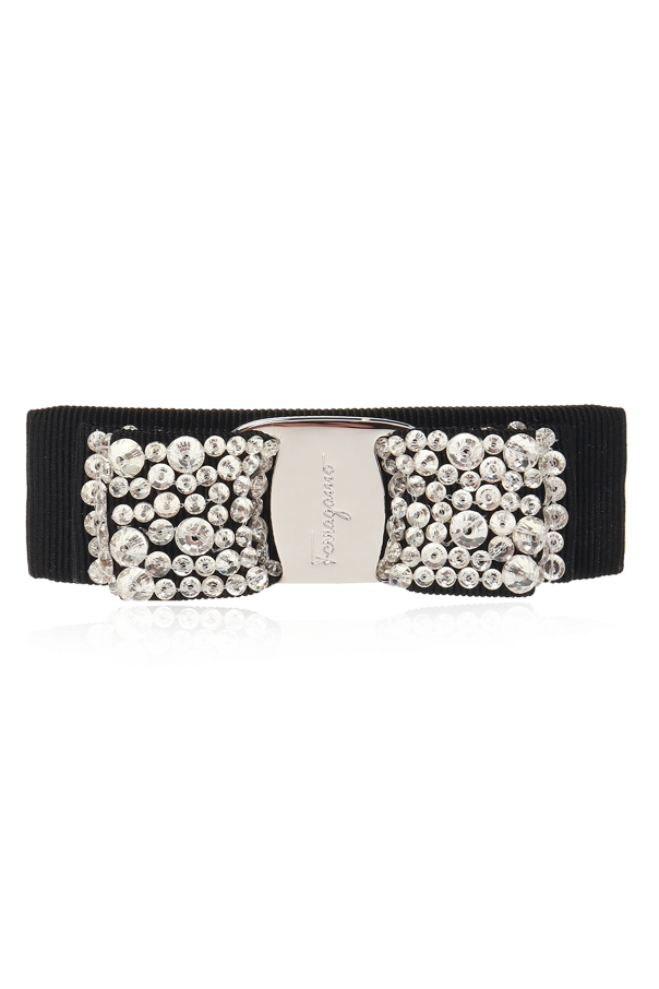 Black hair clip from Salvatore Ferragamo. Crafted from ribbed fabric, this item features a bow, round elements in white and a metal logo-embossed detail in silver-tone.