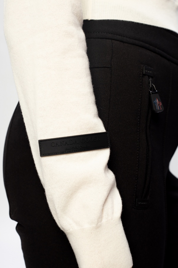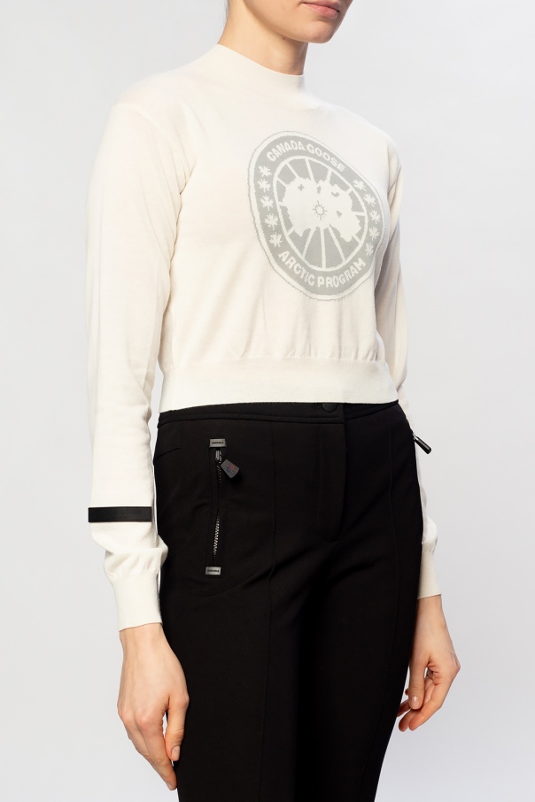 White sweater from Canada Goose x Angel Chen. Made of wool, this garment features an embroidered logo pattern in grey and ribbed trims at the crewneck, hem and cuffs.
