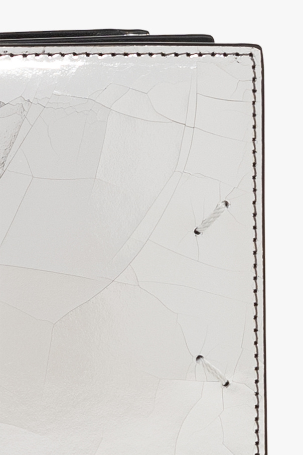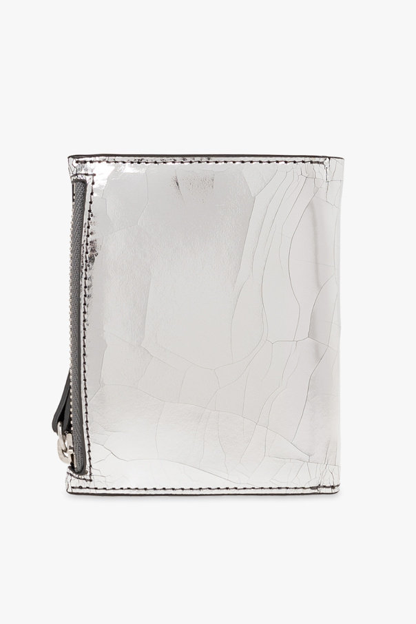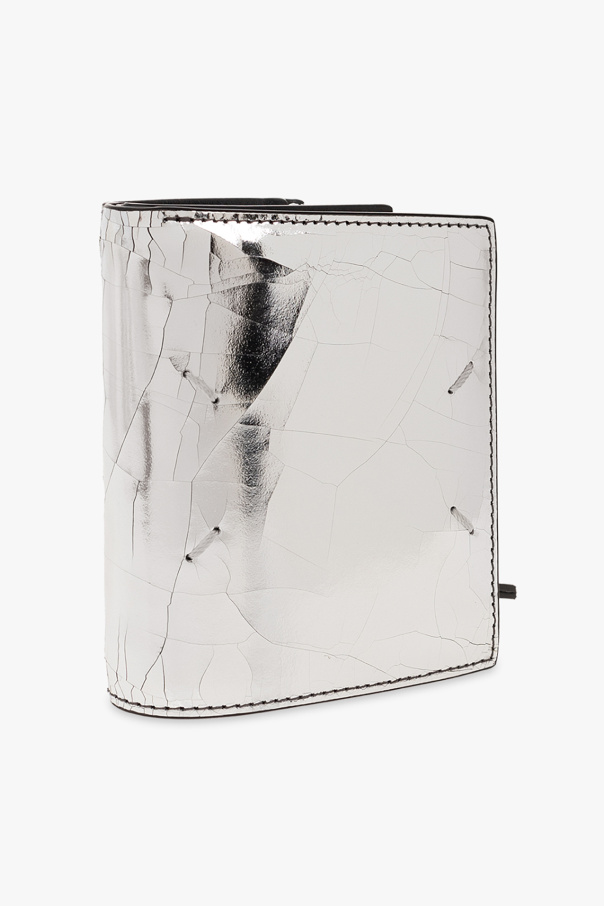Silver-tone bi-fold wallet from Maison Margiela. Crafted from cracked calf leather with a mirror effect, this design features an embroidered logo at the back, one zip coin pocket, one bill compartment, two slip pockets and six card slots.