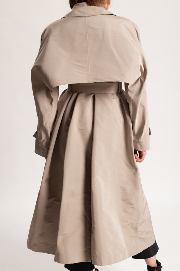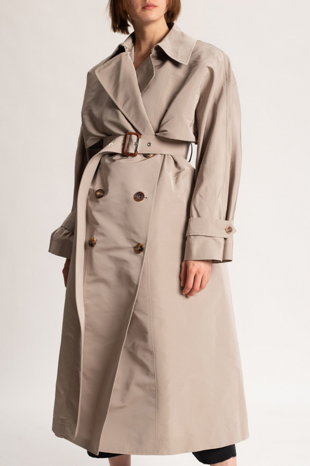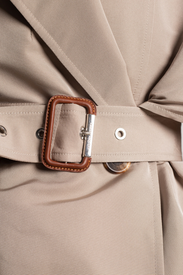 Grey trench coat from Alexander McQueen. Boasting a double-breasted silhouette, this style fastens via buttons and features a buckle belt at the waist, two welt pockets on the front, long sleeves and a single vent at the back.