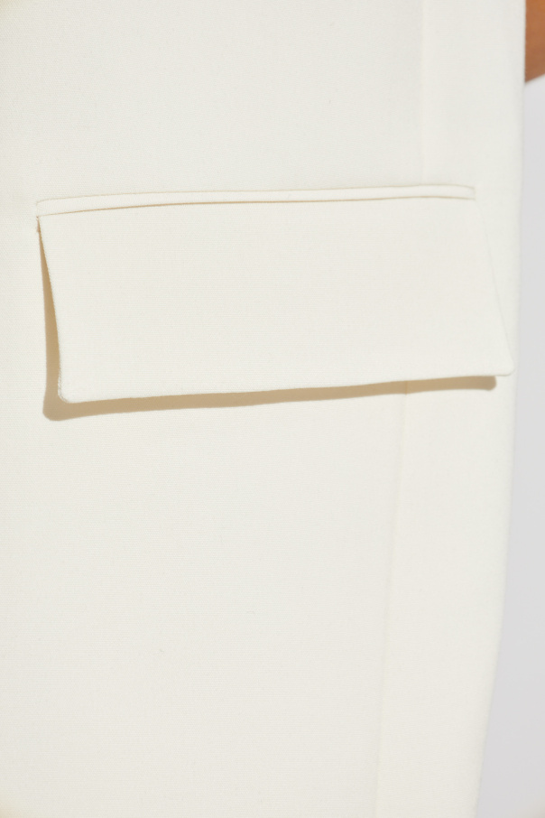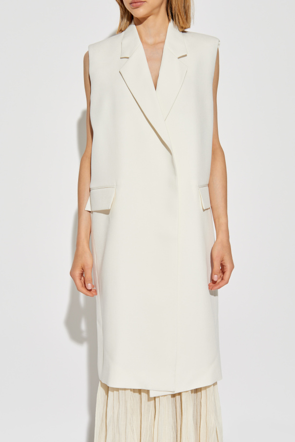 Introducing an exquisite piece from TOTEME's latest collection – the Long Cream Vest. Crafted with a discerning eye for style, this vest is a testament to the blend of modern aesthetics and timeless elegance. Its long, sleeveless design sets it apart in the realm of outerwear, offering a unique character that effortlessly elevates any ensemble. Constructed from a luxurious blend of viscose and polyester, the fabric boasts a subtle sheen that hints at its premium quality, while ensuring comfort and durability. The vest's design is highlighted by wide lapels reminiscent of classic men's suiting, adding a touch of formal elegance. This piece is further enhanced by its single-button closure, which subtly accentuates the waist, and a sharply tailored V-neckline, catering to various body types with a flattering cut. Functional yet fashionable, the vest features two discreetly placed flap pockets on the front panels, blending seamlessly with its minimalist style. The absence of visible branding on the exterior underscores TOTEME's commitment to sophistication and understated luxury, making this vest a versatile addition to both formal and semi-formal wardrobes. Why Purchase This Product? Elegant and modern design, perfect for enhancing any outfit. High-quality fabric with a slight sheen, indicating premium craftsmanship. Versatile styling options, from formal to semi-formal. Attention to detail with wide lapels and a single-button closure for a refined silhouette. Minimalist branding, focusing on the sophistication of the piece itself.