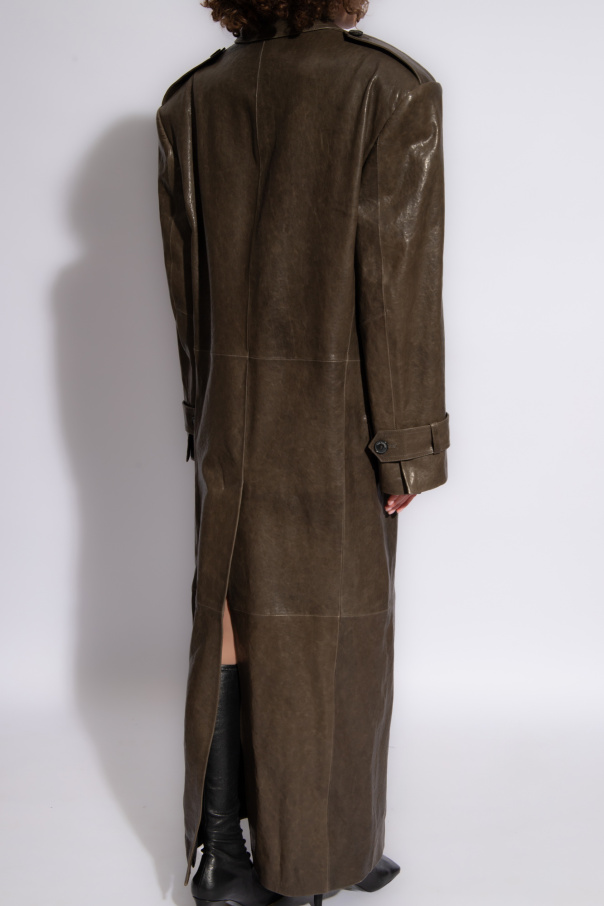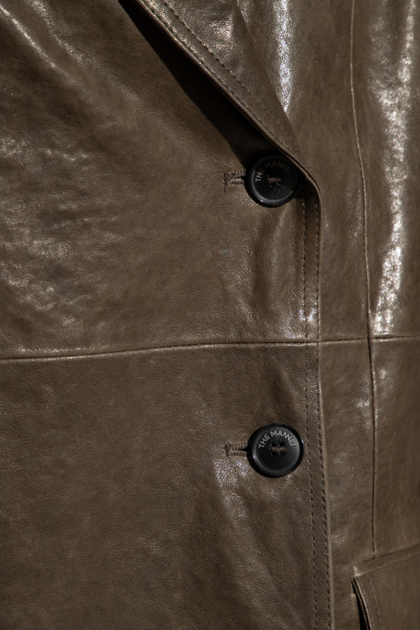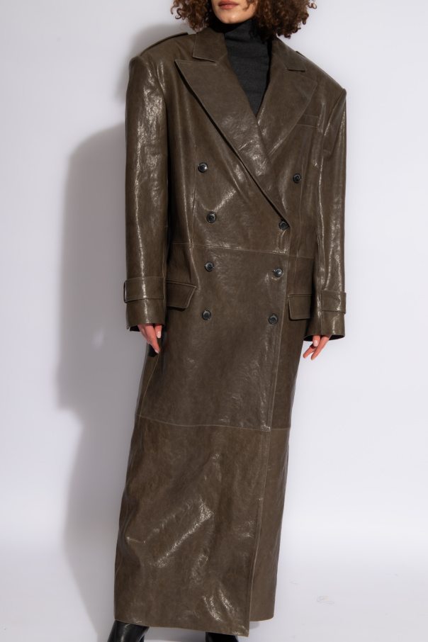 Brown ‘Copenhagen’ coat from The Mannei. Crafted from leather, this double-breasted design features buttons, peak lapels, two flap pockets, one slip pocket, padded shoulders, single rear vent and a vintage effect.