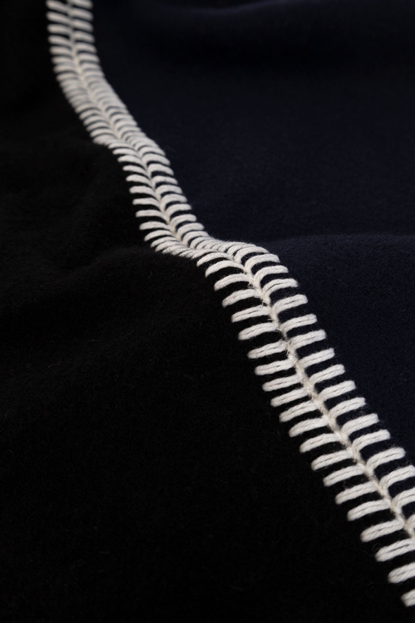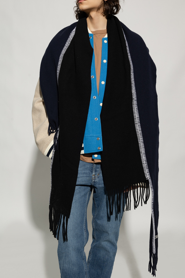 Navy and black ‘Pampero’ asymmetric scarf from Jacquemus. Made of virgin wool, this design features decorative stitching details, white logo embroidery and fringe edges.