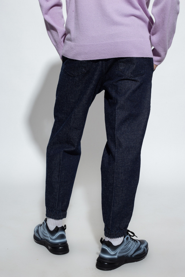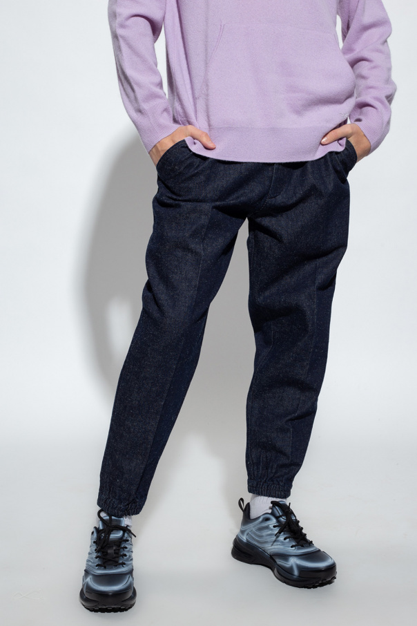 Navy jeans from Emporio Armani. Fastened with a zip, this pair features an elastic waistband, zip closure, two front pockets, two buttoned back pockets, logo appliqué and elasticated cuffs.
