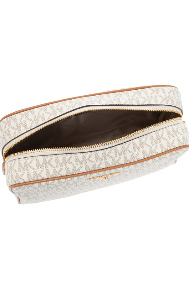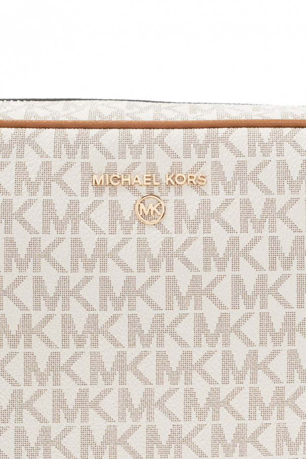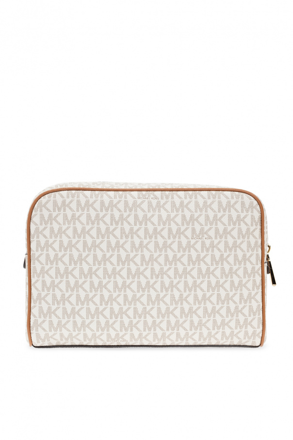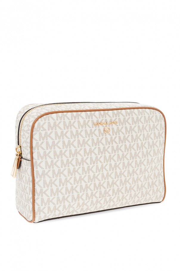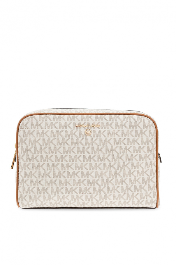 Cream, beige and brown ‘Jet Set’ wash bag from Michael Michael Kors. Crafted from monogrammed canvas, this item features a zip fastening, a metal logo plaque on the front, gold-tone metal hardware and one internal compartment with a slip pocket.