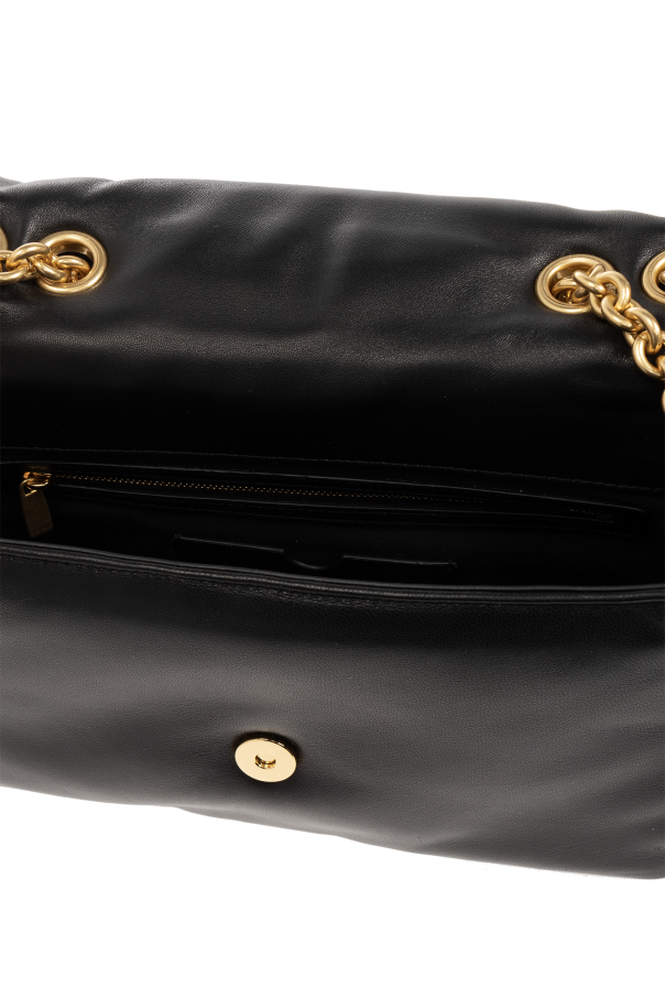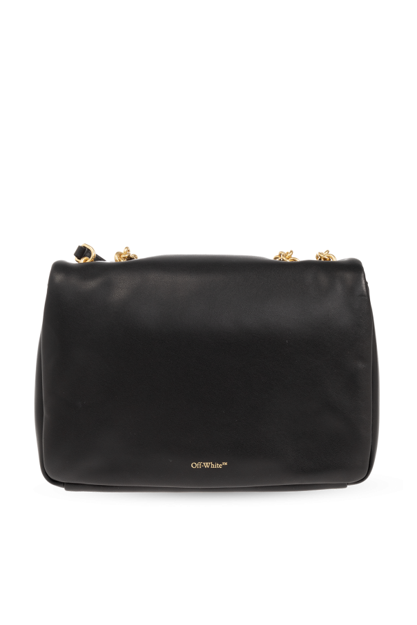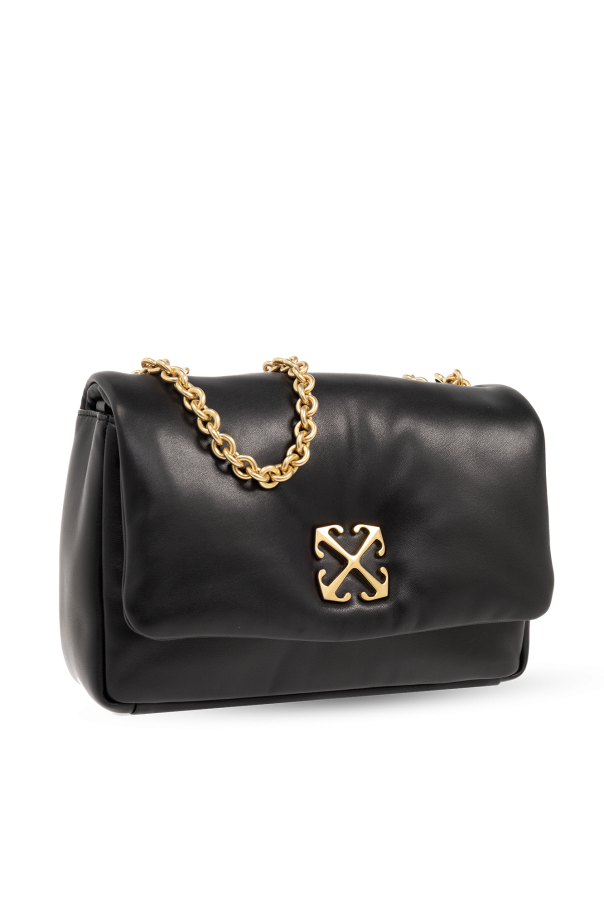 Black ‘Jitney Puffer’ shoulder bag from Off-White. Made of leather, this design secures with a magnetic snap and features a logo-shaped application on the front, a long chain strap interwoven with leather, gold-tone metal hardware and one internal compartment with one zip pocket and one card slot.