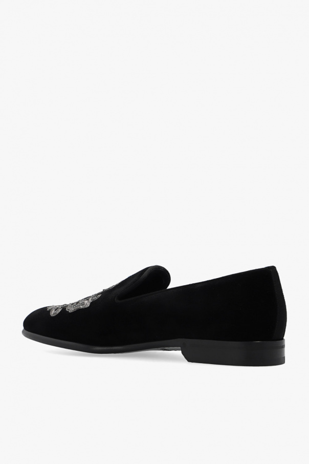 Black loafers from Dolce & Gabbana. Made of velvet, this pair features a decorative logo embroidery, sparkling appliqués and black leather sole.