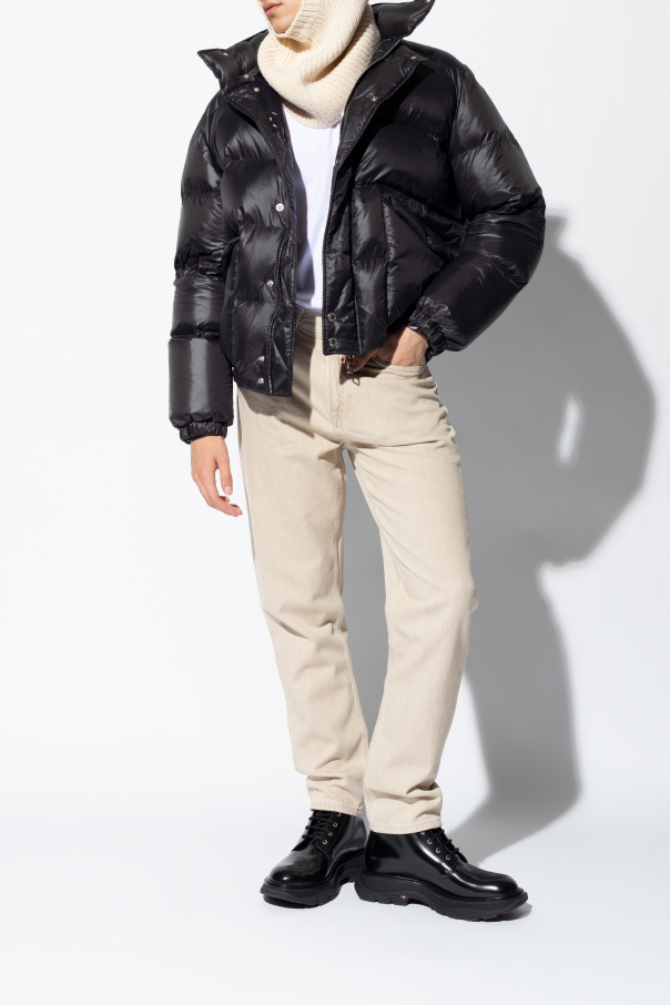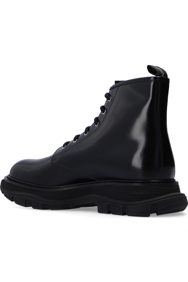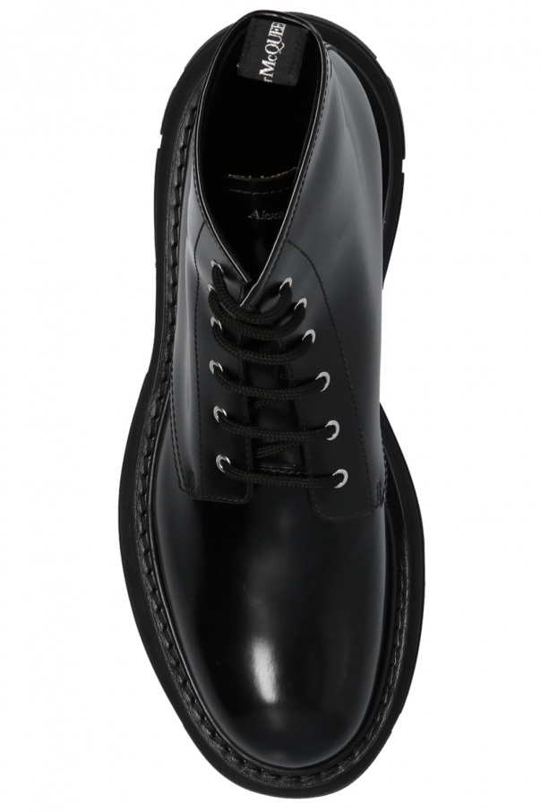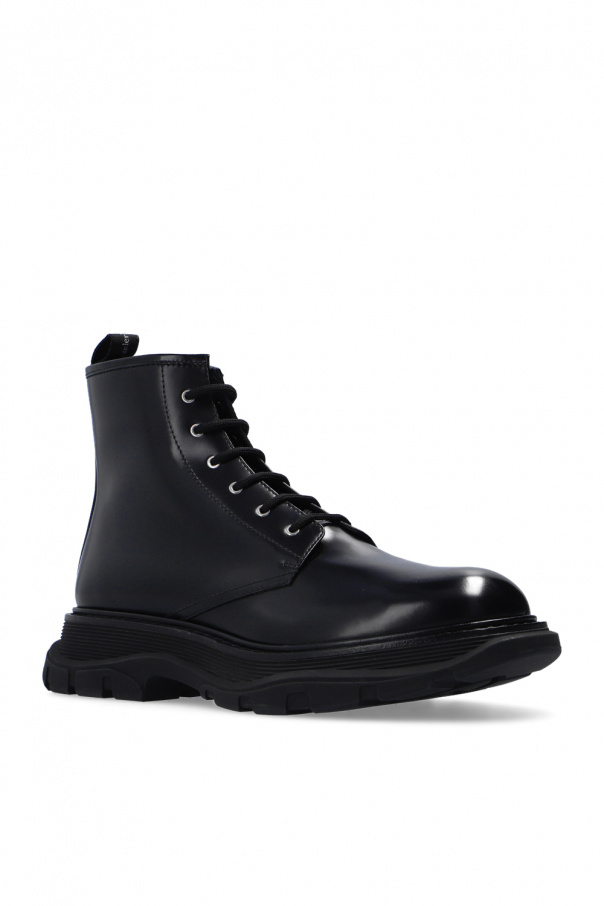 Black ankle boots from Alexander McQueen. Crafted from leather with an almond-toe silhouette, this lace-up model sits on a black rubber sole and features a silver-tone logo-embroidered insert.