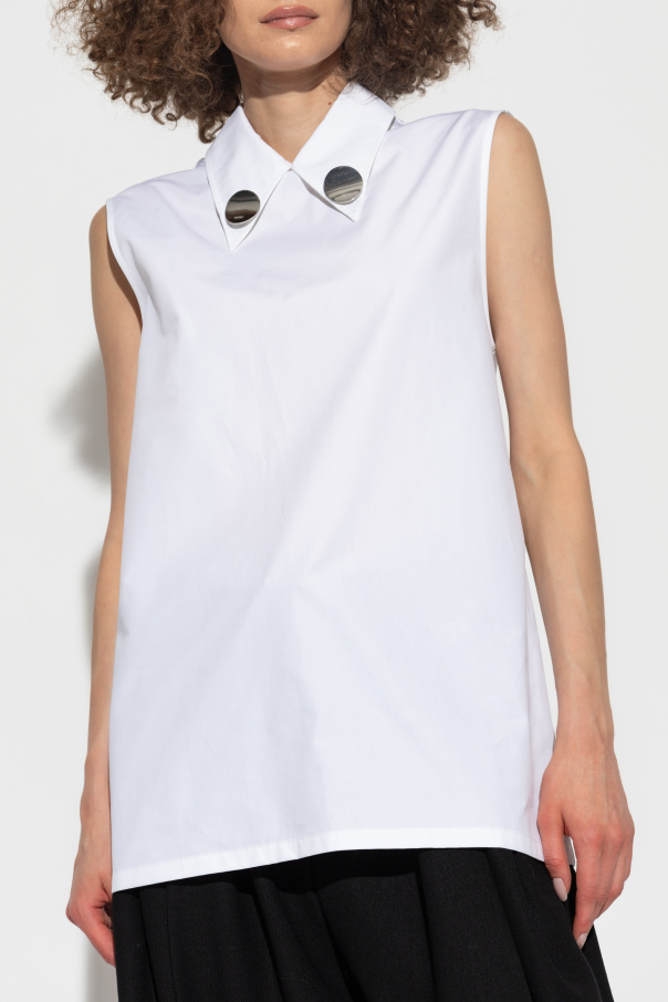 Introducing the Sleeveless Shirt by the renowned designer JIL SANDER. This exclusive white shirt is an epitome of contemporary elegance, crafted meticulously to cater to the discerning tastes of fashion connoisseurs. With its simple, slightly loose fit, this shirt offers a modern, airy look perfect for any sophisticated wardrobe. The shirt features a distinguished sleeveless design and a length that gracefully reaches mid-hip, providing a versatile silhouette. The collar is adorned with two large, metallic buttons that add a touch of brilliance with their mirror-like sheen, enhancing the shirt’s unique aesthetic. The back of the shirt is accentuated with a vertical fabric strip, serving both decorative and functional purposes. Expertly made from high-quality 100% cotton, this shirt ensures unparalleled comfort and breathability. The pristine white color further underscores its minimalist and elegant design, making it suitable for both casual and formal occasions. For added convenience, the shirt features a zipper and snap closure, seamlessly blending practicality with style. Why Choose This Product? Designed by the prestigious JIL SANDER High-quality 100% cotton for ultimate comfort Unique metallic button embellishments Versatile sleeveless design suitable for various occasions Convenient zipper and snap closure
