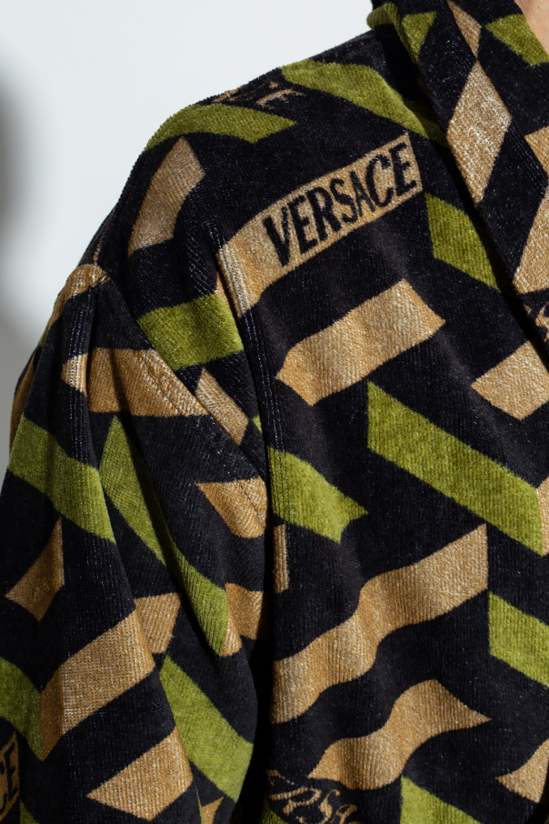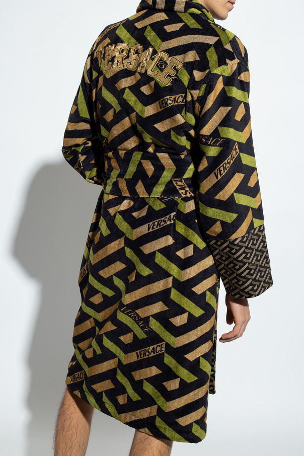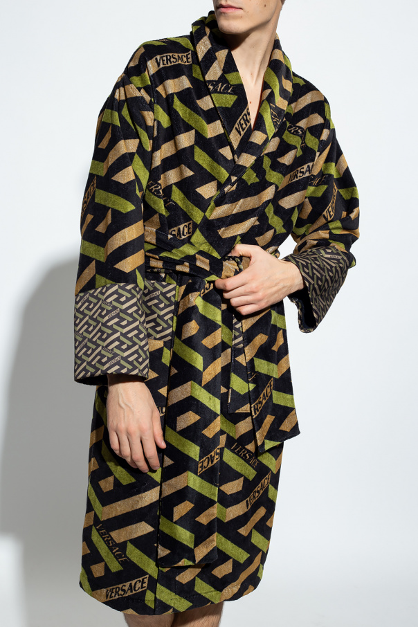 Black, green and brown bathrobe from Versace Home. Made of cotton, this garment features a logo pattern, tie belt, two slip pockets and long sleeves.