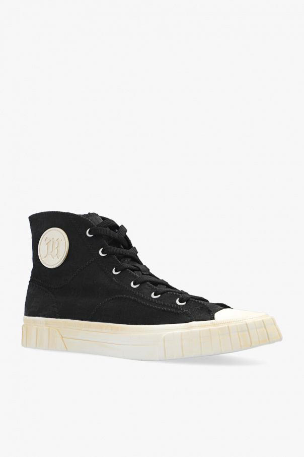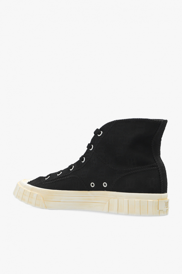 Black ‘Army High’ high-top sneakers from MISBHV. Made of canvas with a jacquard monogram pattern, this lace-up pair features a logo patch and cream rubber sole.