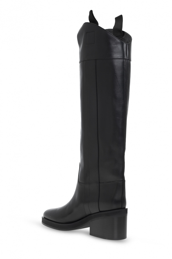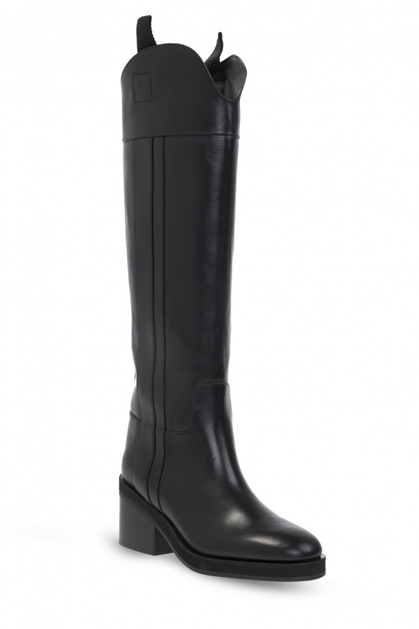 Black ‘Tonya’ heeled boots from Jimmy Choo. Made of leather, this pair rests on a black rubber sole.