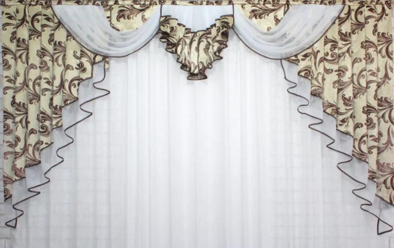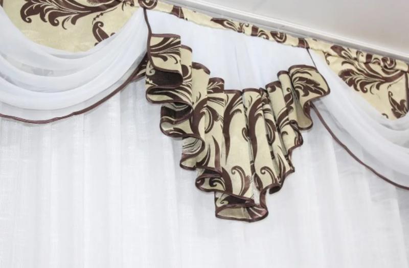 Колір - бежевий із коричневим. Краї ламбрекену обшиті атласною бейкою.
