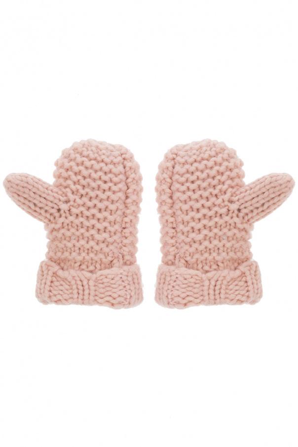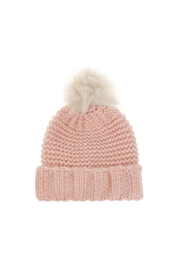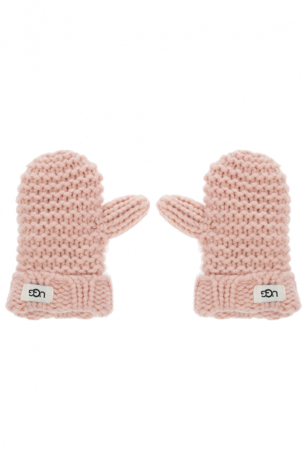 Light pink beanie & gloves set from UGG Kids. Emblazoned with a white and black logo patch, they feature a faux-fur pompom.