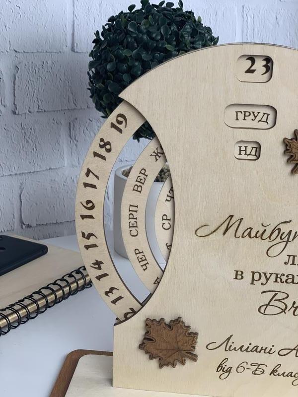 Особлива родзинка нашого вічного календаря з дерева - індивідуальне гравіювання. Це може бути логотип компанії, будь-який напис чи малюнок. Оскільки в процесі виготовлення ми використовуємо лише високоякісну березову фанеру, такий настільний календар довго зберігатиме свій бездоганний вигляд.