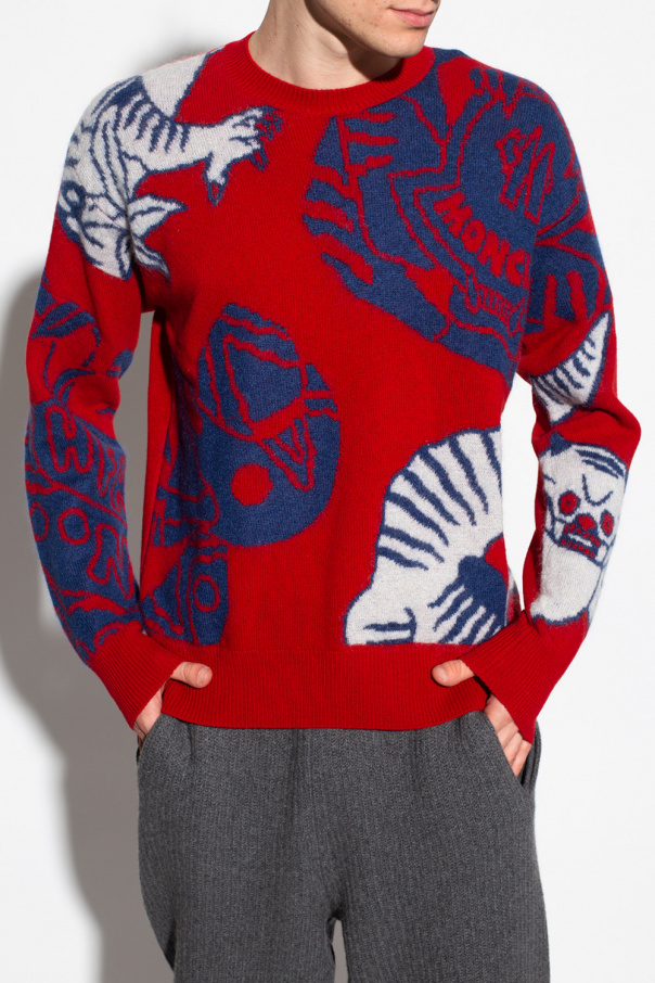 Red crewneck sweater from Moncler. Crafted from wool, this style showcases a blue and white graphic pattern and ribbed trims on the collar, bottom hem and cuffs.