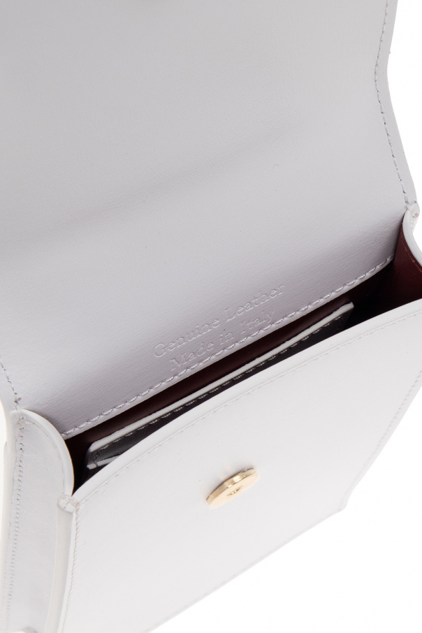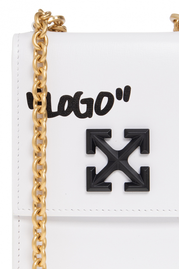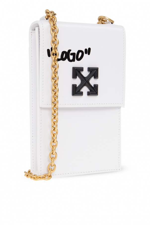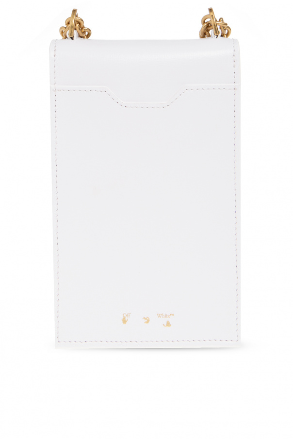 White phone case from Off-White. Made of leather, this model features a magnetic snap, print, black logo appliqué, back pocket, shoulder chain, gold-tone metal hardware and one internal compartment with two card slots.