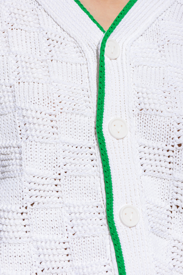 White cardigan from Bottega Veneta. Crafted from fabric with a distinctive knit evoking the brand's iconic Intreccio weave, this style features a V-neckline with green binding, button fastenings and elasticized trims on the bottom hem and cuffs.