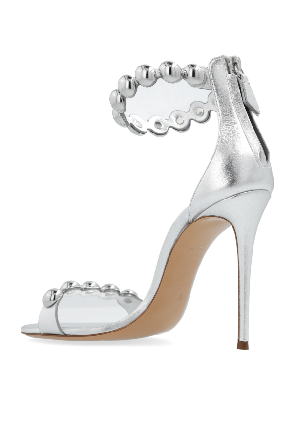 Introducing the ‘Tropicana Julia’ High Heels Sandals by the esteemed designer Casadei, a marvel of craftsmanship that elevates any ensemble to the zenith of luxury. Crafted from the finest leather, these sandals boast a radiant silver hue, enriched with a metallic finish that captures and reflects the light, ensuring you stand out with every step. The sandals feature an exquisite design with slim, high stiletto heels that elongate the legs, while delicate straps gracefully hug the foot, promising both allure and stability. A unique pattern of large, round embellishments, reminiscent of opulent beads, adorns the straps across the ankle and toes, creating a cohesive and sophisticated aesthetic. The meticulous placement of these decorative elements, coupled with the sandals' almond-shaped toe and sleek, rear zipper closure, epitomizes elegance. The interior and sole are also crafted from leather, ensuring durability and comfort, making these sandals not only a statement of style but a testament to quality. Why Purchase This Product? Luxurious Design: The metallic silver leather and round appliqués offer an unmatched elegance. Exquisite Craftsmanship: Made by Casadei, a name synonymous with quality and sophistication in fashion. Comfort and Durability: Leather construction ensures both comfort for prolonged wear and durability. Versatile Elegance: Perfect for enhancing both day and evening attire with a touch of glamour.