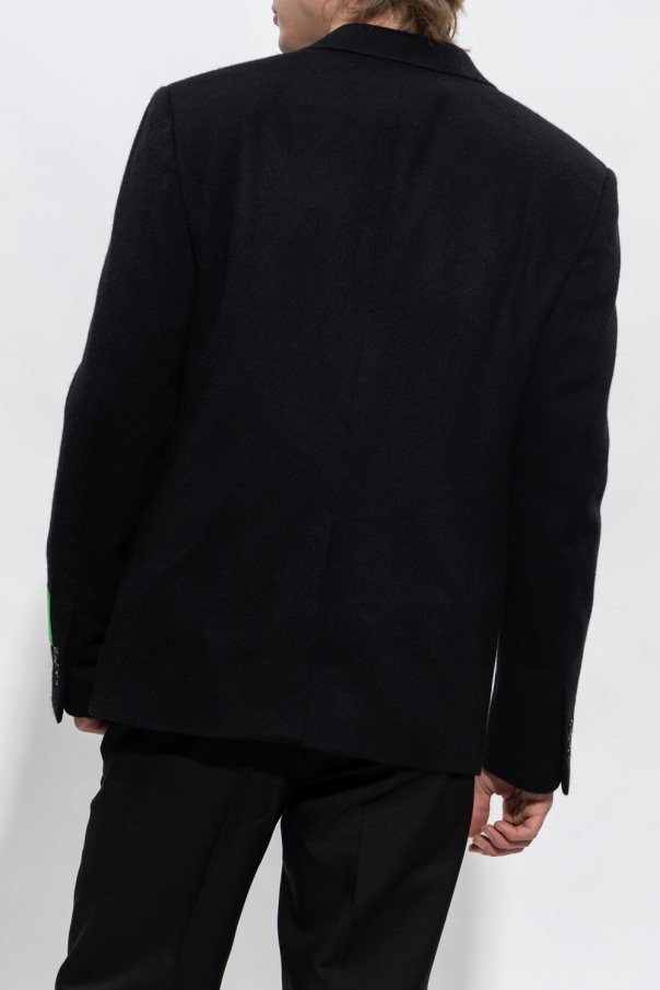Black blazer from Off-White. Crafted from cashmere, this style features notch lapels, button fastenings, three frontal pockets, a single back vent and long sleeves accentuated with a green patch and logo embroidery.