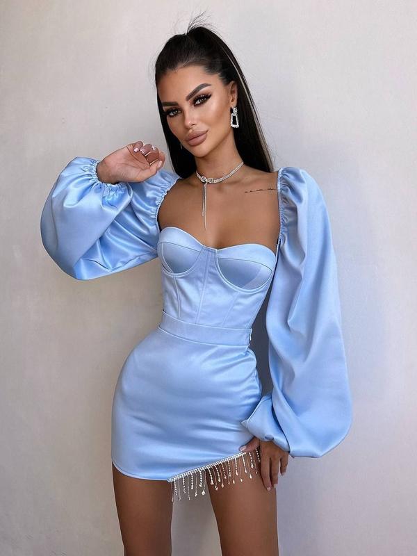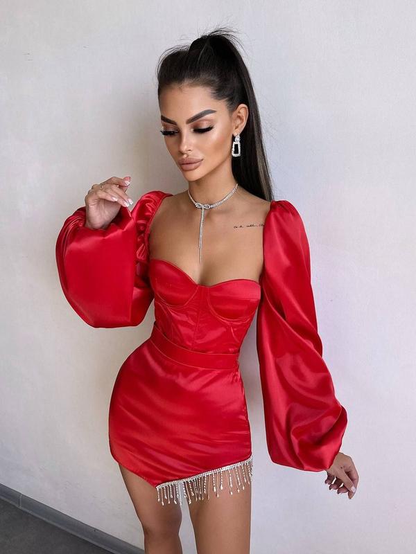 Атласный комплект: корсет + юбка декорирована бахромой из страз