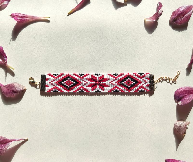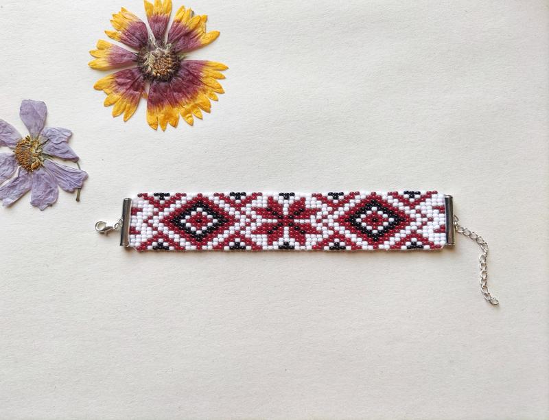 Зроблено в Україні?:Производство ,Материал:Бисер , Сплав ,Пол:Для женщин , Для мужчин , Для девочек ,Тематика:Геометрия , Национальная символика ,Замок:Карабин ,Тип:На руку ,Описание