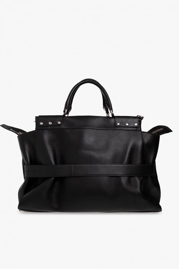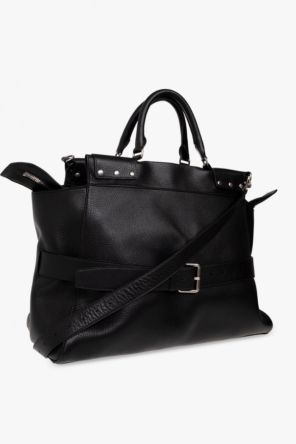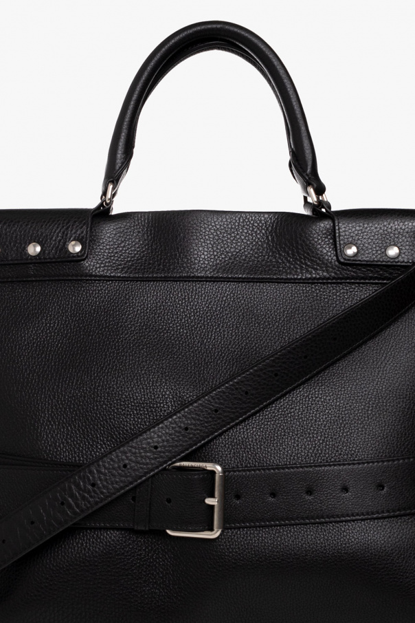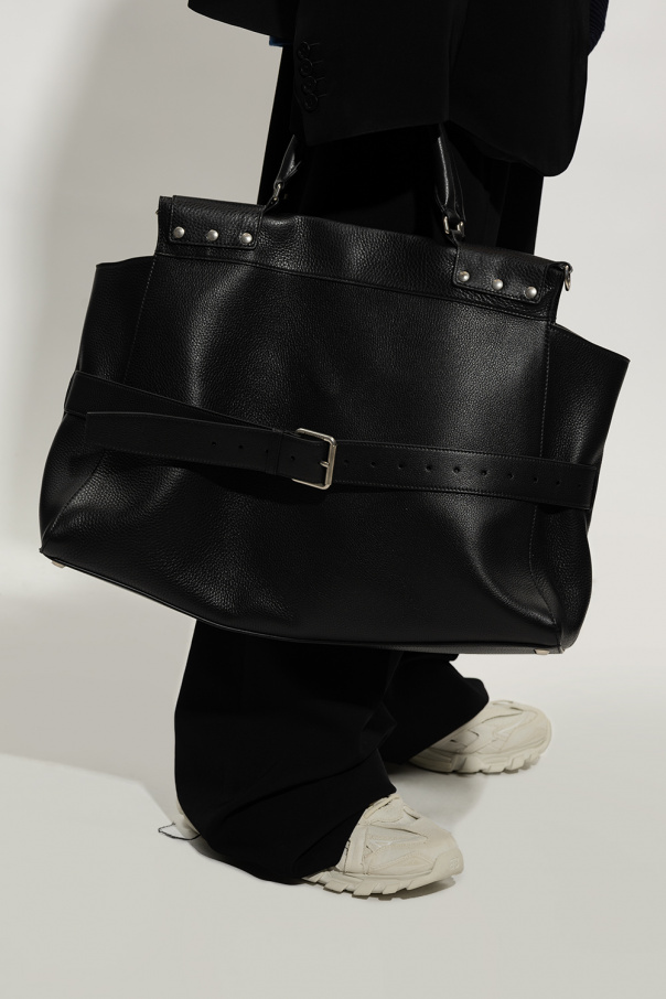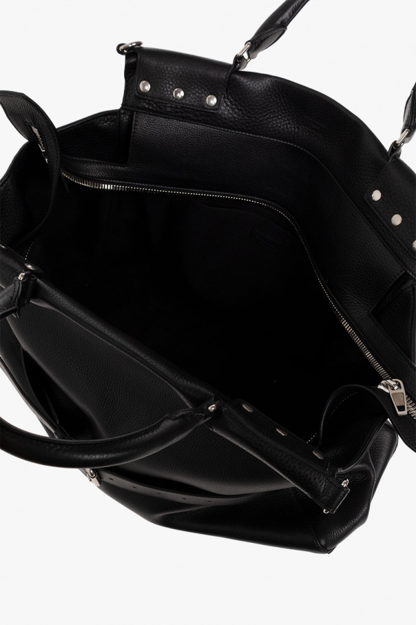 Black ‘Waist Large’ shopper bag from Balenciaga. Crafted from studded calf leather, this design secures with a two-way zipper and features a tab to adjust its size, two half-round handles, a detachable and adjustable shoulder strap, silver-tone metal hardware and one internal compartment with one zip pocket and one slip pocket.