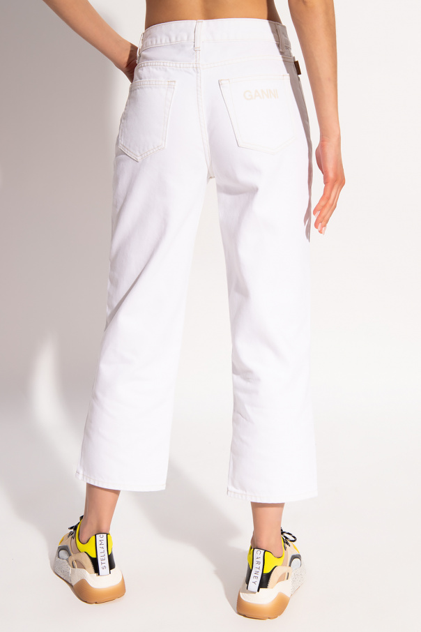 White jeans from Ganni. Made of cotton, this design falls down with slightly tapered legs and is complete with a zip fly and button, five slip pockets, beige logo print and decorative stitching details.