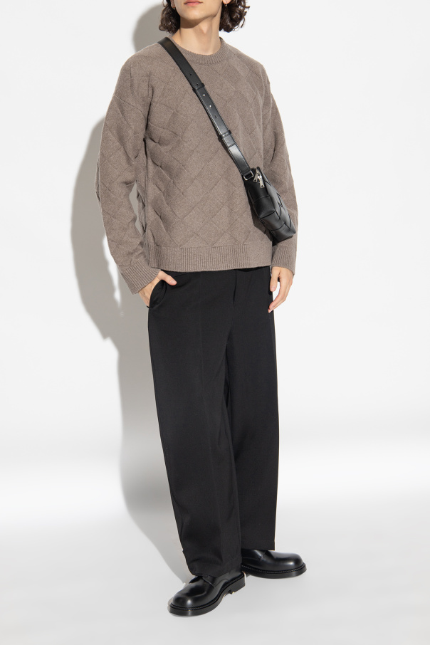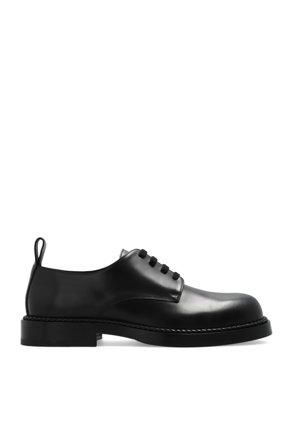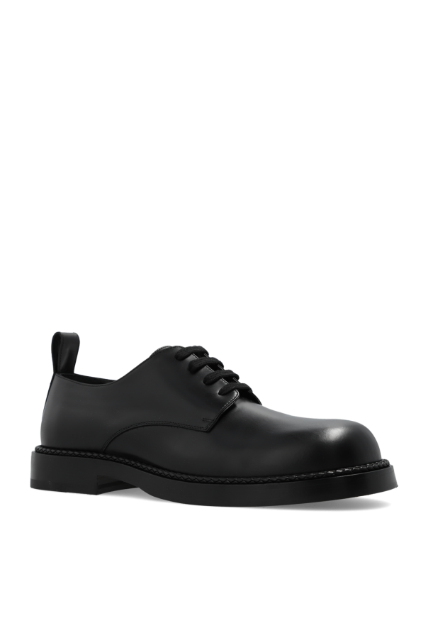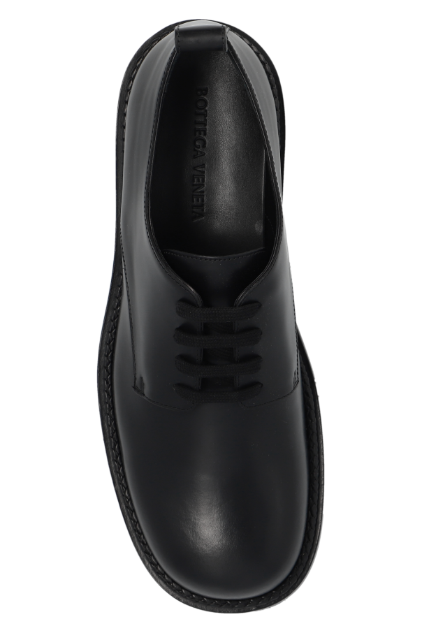 Black ‘Strut’ derby shoes from Bottega Veneta. Crafted from leather, this lace-up pair features decorative trimming as well as a black and beige sole made of leather and rubber.