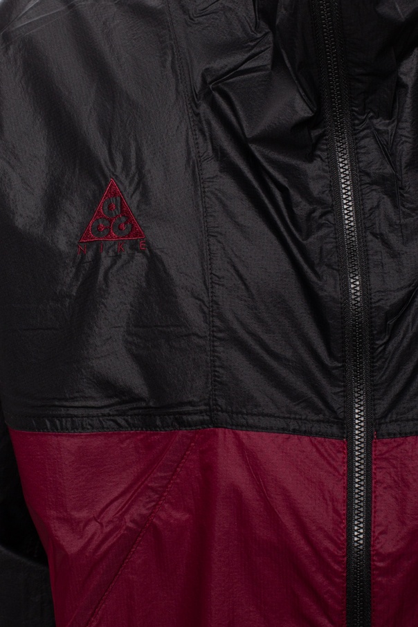Maroon and black hooded jacket from Nike, ‘ACG’ collection. Crafted from lightweight fabric with a DWR (durable, water-repellent) finish, this packable item features a zip fastening, printed pattern, embroidered logo, two zip pockets and ribbed trims. This product was designed and tested in Oregon, USA. The state's vast wilderness and climate served as inspiration for the jacket's look and purpose. Nike ACG (All Conditions Gear) apparel is designed to provide convenient solutions for an unpredictable outdoor landscape.