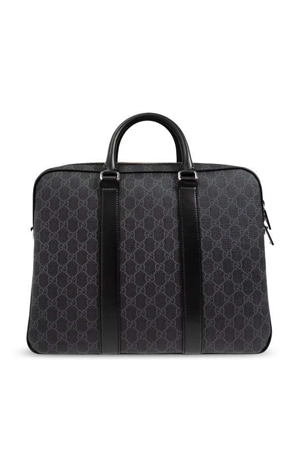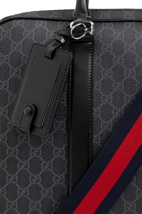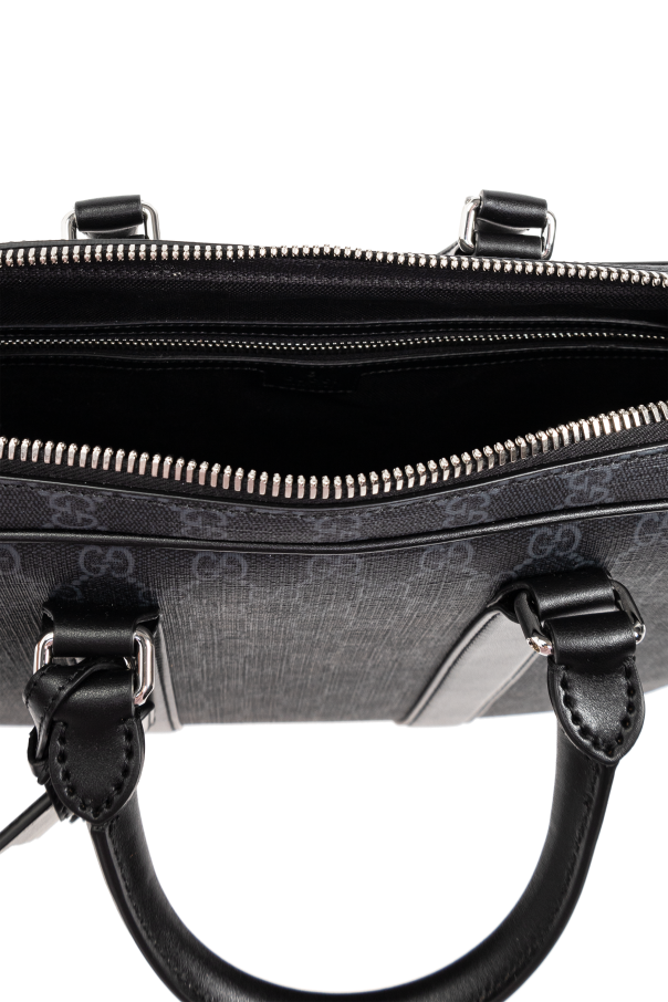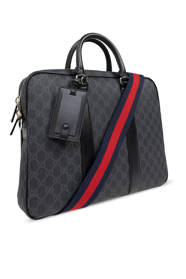 Introducing the epitome of sophistication and functional elegance: the Monogrammed Briefcase by the renowned designer Gucci. Crafted with an exquisite blend of calfskin leather and 'GG Supreme' canvas, this briefcase stands as a testament to luxurious durability and timeless aesthetics. Its classic black hue, accentuated with a distinctive monogram pattern, ensures versatility and seamless integration into any professional ensemble. The briefcase’s structure is meticulously designed with sharp edges and rounded corners, presenting a modern silhouette that exudes confidence. Functionality meets style with its detachable and adjustable shoulder strap, featuring iconic red and navy stripes that inject a dash of sportive allure. The front of the briefcase is adorned with a broad black band that highlights its texture, while a black leather luggage tag offers a personalized touch. Silver metal accents, including closures and zippers, provide a striking contrast, enhancing the briefcase's elegant appeal. Practicality is not compromised, as the main compartment, secured by a dual-directional zipper, is spacious enough to accommodate A4 documents and essential professional gear. Inside, a compartment with two pockets — one slip and one zippered — offers organized storage for smaller items. This black and gray masterpiece is not just a carrying solution but a statement of unparalleled craftsmanship and luxury. Why Purchase This Product? Exclusively designed by Gucci, a symbol of high-end fashion. Constructed from premium calfskin leather and 'GG Supreme' canvas for enduring elegance. Features a detachable and adjustable sportive striped shoulder strap for versatile carrying options. Equipped with a functional interior, including two pockets for optimal organization. Adorned with sleek silver metal hardware for a refined finish.
