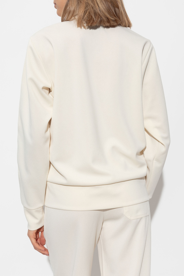 Introducing the Golden Goose Zip-Up Sweatshirt, a luxurious piece epitomizing contemporary elegance and comfort. This cream-colored sweatshirt is crafted from a smooth and soft material, likely a blend of cotton and synthetic fibers, ensuring unparalleled comfort and longevity. The sweatshirt features a full-length zipper at the front, complemented by a high collar that provides an extra layer of warmth and sophistication. Adorning the sleeves, a distinctive pattern of black stars on a white background infuses a modern and fashionable flair into the design. Functionality meets style with the inclusion of two side pockets at the waist, ideal for keeping your hands warm or storing small essentials. Enhanced with elasticated cuffs and hem, this sweatshirt offers a perfect fit that flatters every silhouette. Emblazoned on the left chest, the "STAR" logo, accompanied by additional text, signifies the brand's exclusive identity and collection. This exquisite piece, part of a matching set with coordinating pants, is a testament to Golden Goose's impeccable craftsmanship and unique aesthetic, blending traditional artistry with a rebellious spirit. Why You Should Buy This Product Luxuriously soft and durable material Full-length zipper and high collar for added warmth Distinctive black star pattern on the sleeves Convenient side pockets Elasticated cuffs and hem for a perfect fit Exclusive "STAR" logo detailing