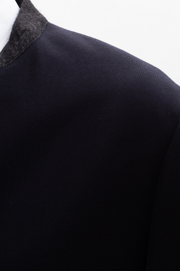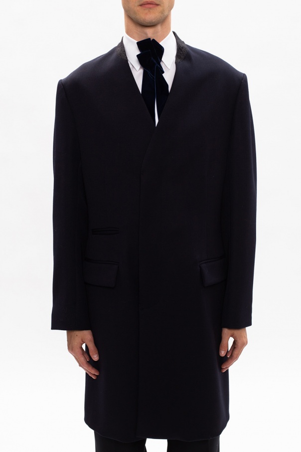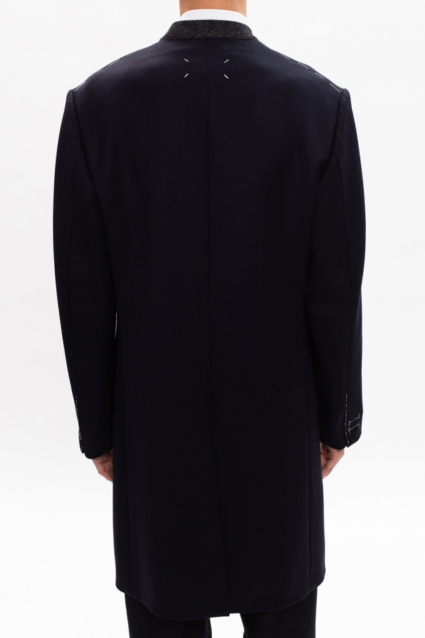 Navy coat from Maison Margiela. Crafted from wool, this garment fastens with buttons and features three slip pockets, white stitching details and a slit at the back.