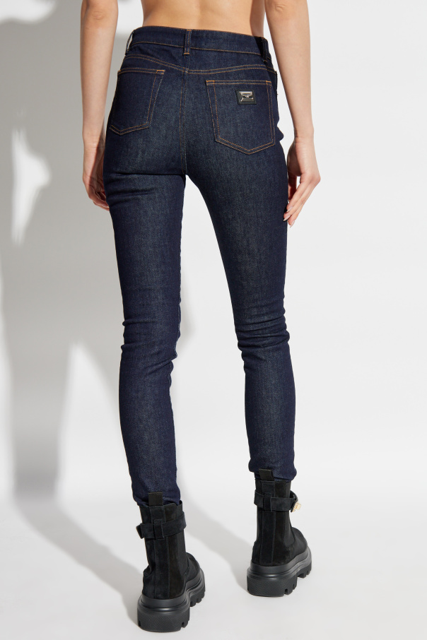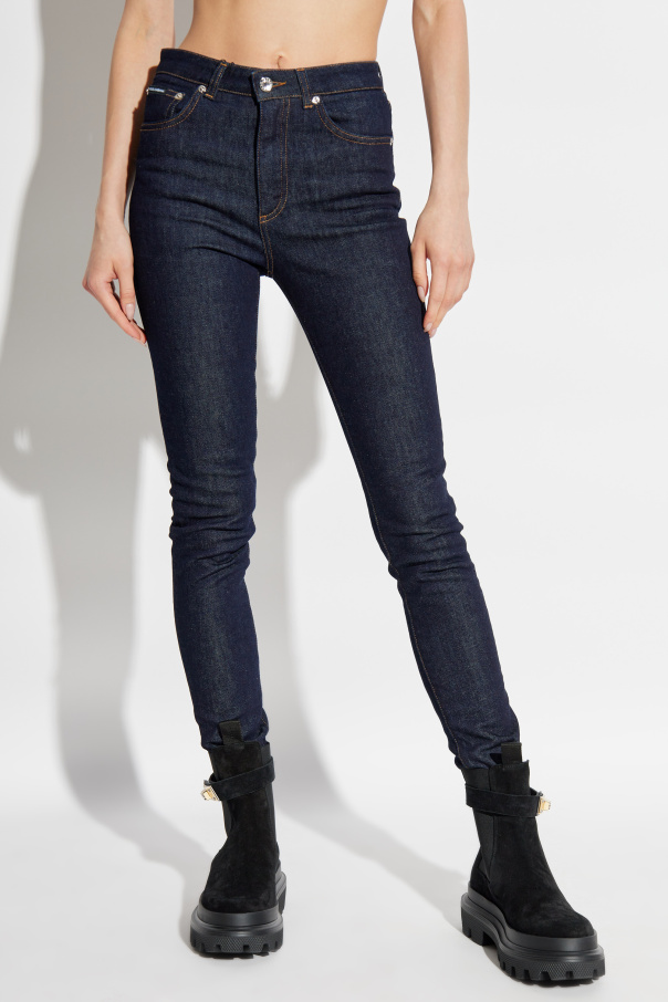 Dolce & Gabbana Jeansy z logo - wyjątkowy element garderoby, który łączy w sobie klasykę z nowoczesnym akcentem. Te granatowe skinny jeansy, wykonane z wysokiej jakości, grubego denimu, oferują niezrównaną elegancję i trwałość. Prosty, jednolity granatowy wzór bez dodatkowych przetarć sprawia, że są one idealnym wyborem na każdą okazję. Charakterystyczne żółte przeszycia oraz metalowa plakietka z logo projektanta na tylnej kieszeni podkreślają ekskluzywny charakter tych jeansów. Wysoki stan z szerokim pasem oraz zapięcie na metalowy guzik i zamek błyskawiczny zapewniają dodatkowe podtrzymanie i komfort. Te jeansy posiadają dwie przednie kieszenie boczne, małą kieszonkę na monety oraz dwie klasyczne tylne kieszenie, oferując praktyczność bez kompromisów w stylu. Dlaczego warto kupić ten produkt? Wysokiej jakości, gruby denim, który nie rozciąga się. Elegancki i klasyczny granatowy design. Wysoki stan z szerokim pasem dla dodatkowego komfortu. Metalowa plakietka z logo projektanta na tylnej kieszeni. Praktyczne kieszenie: dwie boczne, mała kieszonka na monety oraz dwie tylne.
