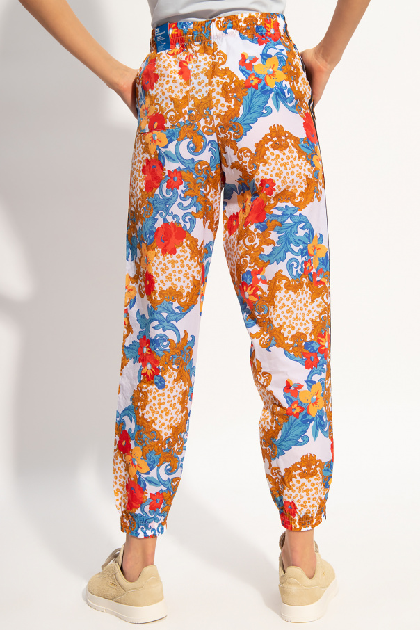 White trousers from ADIDAS Originals. Fastened with drawstrings, this design features a printed multicolored logo pattern, the iconic three stripes in black, two front pockets, one back pocket and ribbed cuffs.