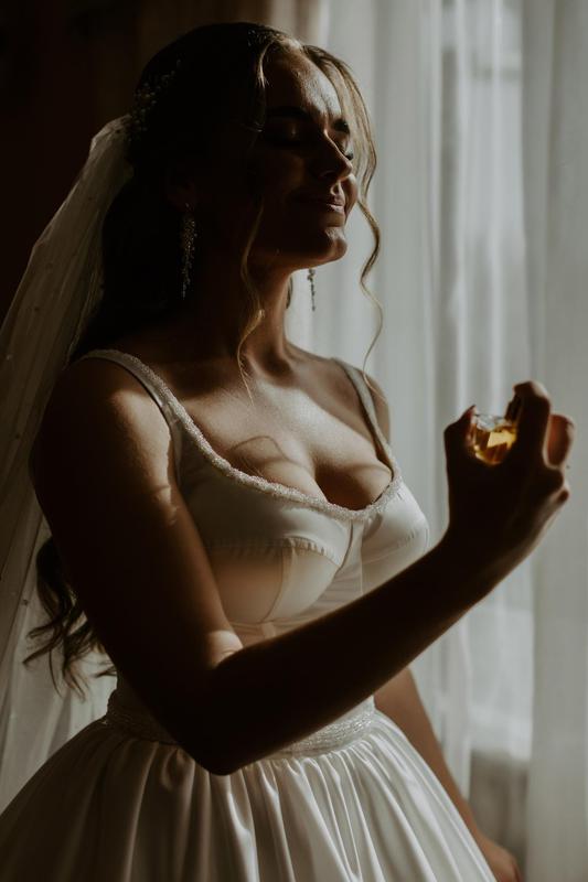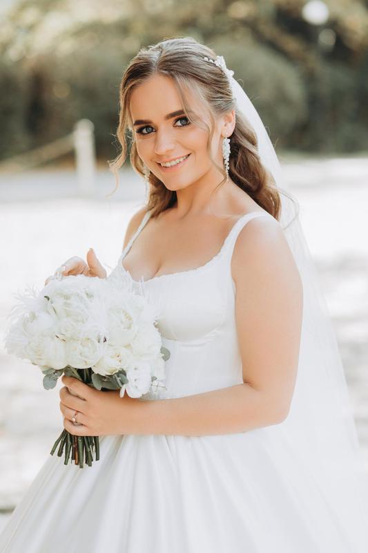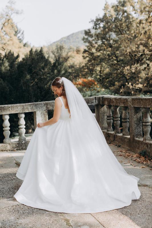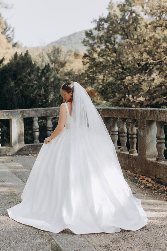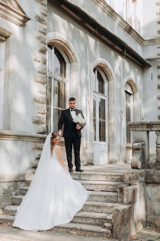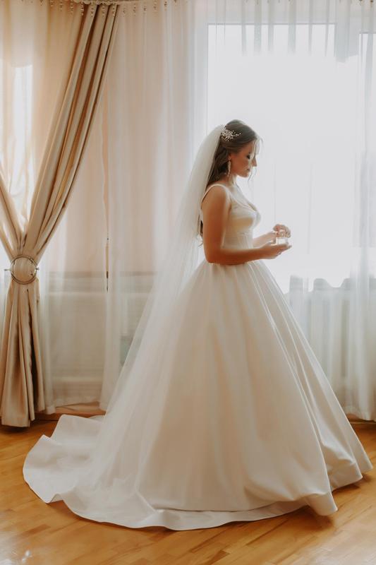 Дуже красиве, витончене весільну сукню з невеликим шлейфом і нашитим кришталем 👰🏼♀️💎 Для прихильниць королівського мінімалізму👑 Матеріал: атлас Розмір: 38 Одягнене на ріст 160+10 см каблук. Стан: ідеальний, після американської хімчистки. Ніяких плям, зачіпок немає. Атлас не повнить, не мнеться. Дорогий перелив🤩виглядає шикарно. Знизу смужка - окантовка. Шлейф підстьобується, щоб було зручно ходити. Фата з ідеальним попаданням в колір сукні і довжина до кінця шлейфу Ціна за сукню і фату. В подарунок віддам🎁: чохол, вішалка, коло🪄