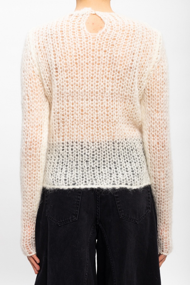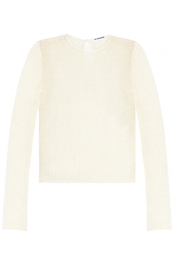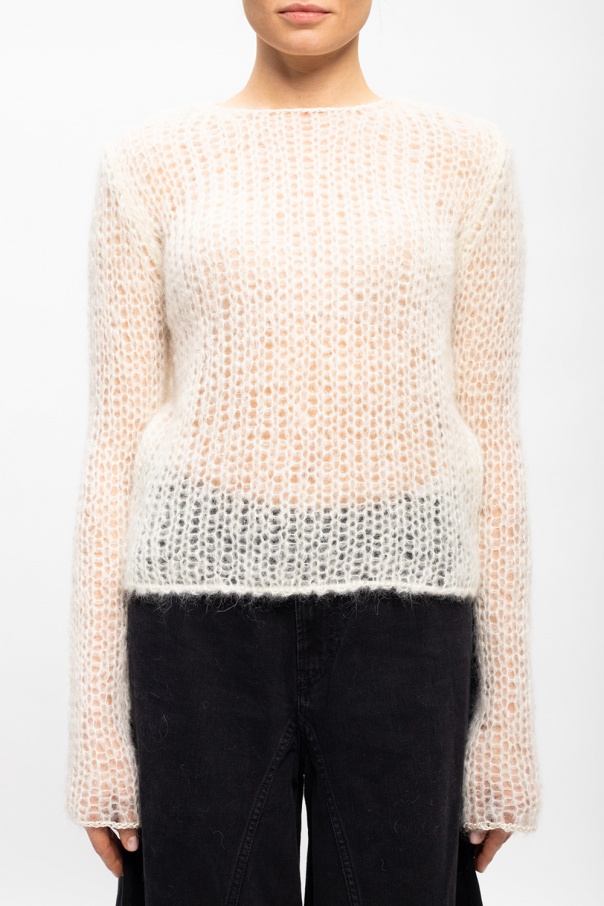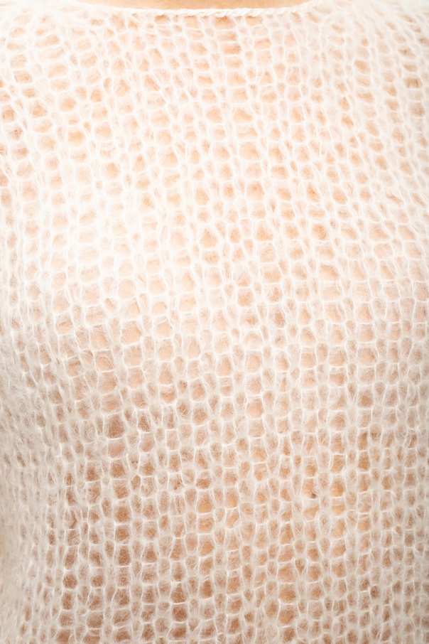 Cream openwork sweater from Jil Sander. Crafted from mohair, this round neck design features hook and eye fastening at the back.
