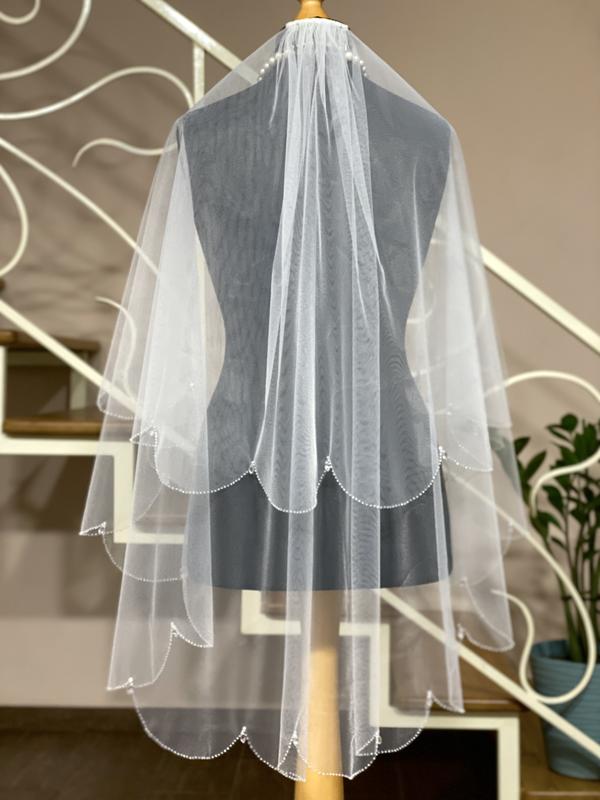 Весільна фата з кришталевими підвісками, типу Сваровськи. Краї фаті обшиті бісером, викройка рюшами-воланами. Вуаль пришита на гребінь для зручності кріпити у зачіску. Довжина двуслойної фаті : нижній шар - 90см, верхній 60см(можна перевернути на обличчя типом вуаль). Ручна робота, прозорою ниткою. В наявності є декілька відтінків еврофатину: білий, молочний, айворі, персик. ( Пишіть вишлемо фото в приват).
