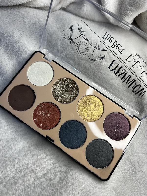 Палитра на 8 оттенков, 1 из них глиттер, 1 матовый, остальные сатиновые. Стан очень хорош, делала только свящительные!